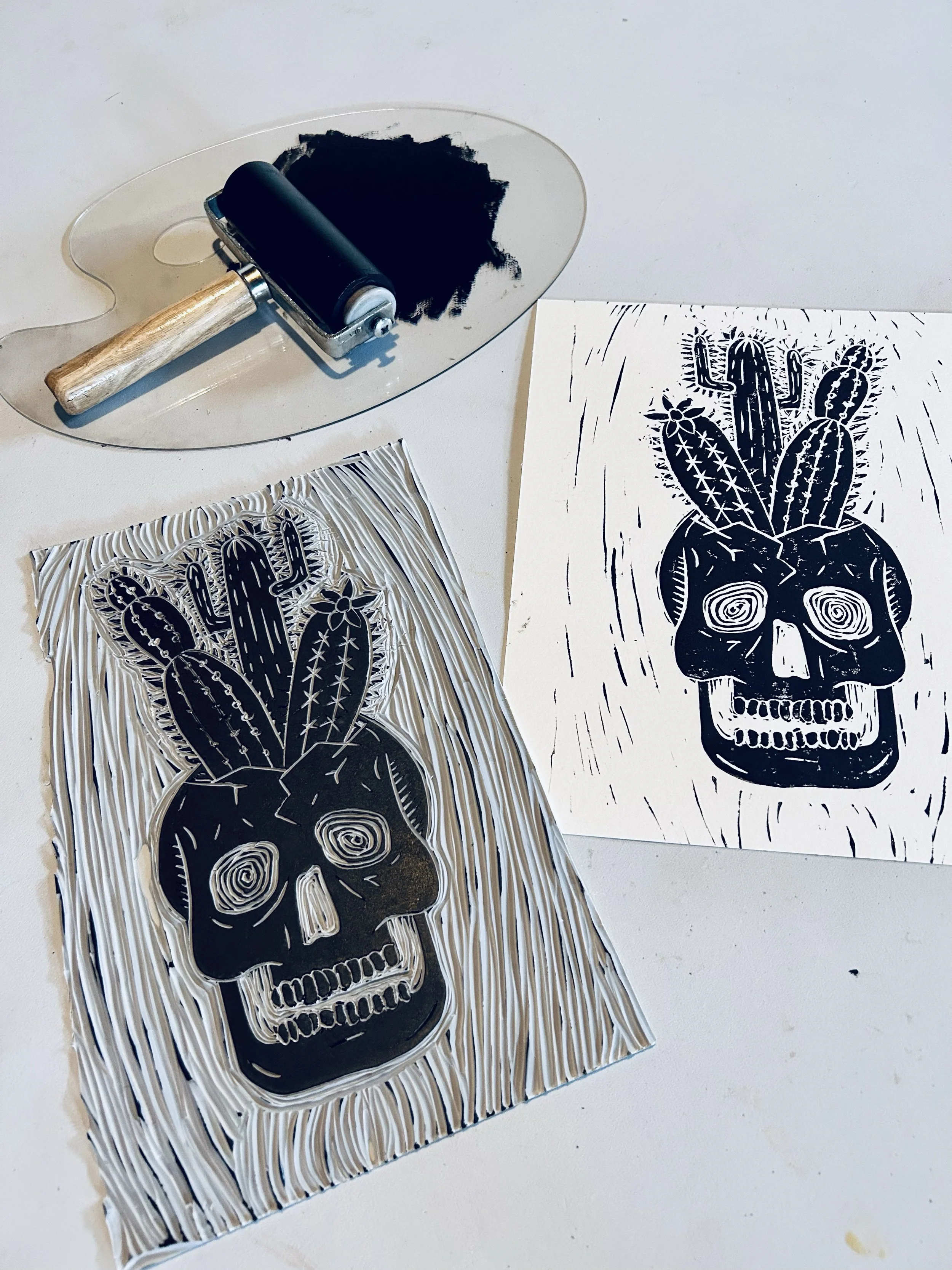 From linoleum block to finished print, each piece is a story carved by hand and brought to life through color.