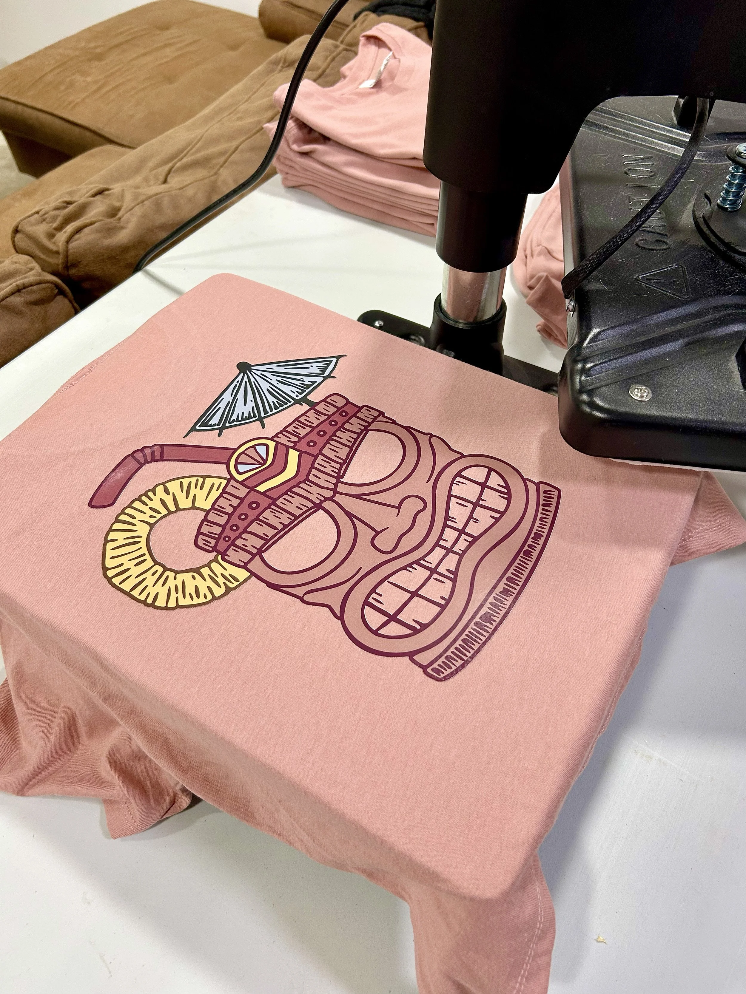 What started as a hand-carved print continues through a digital process. Each piece is scanned and transformed into vector artwork, where linework is refined and color is expanded. This allows the original designs to live beyond the print—appearing on stickers, apparel, and other everyday items.